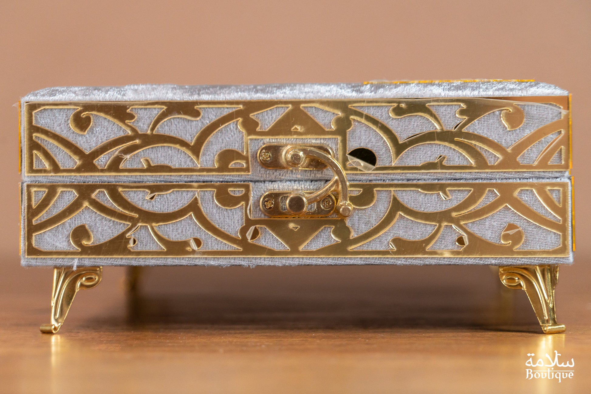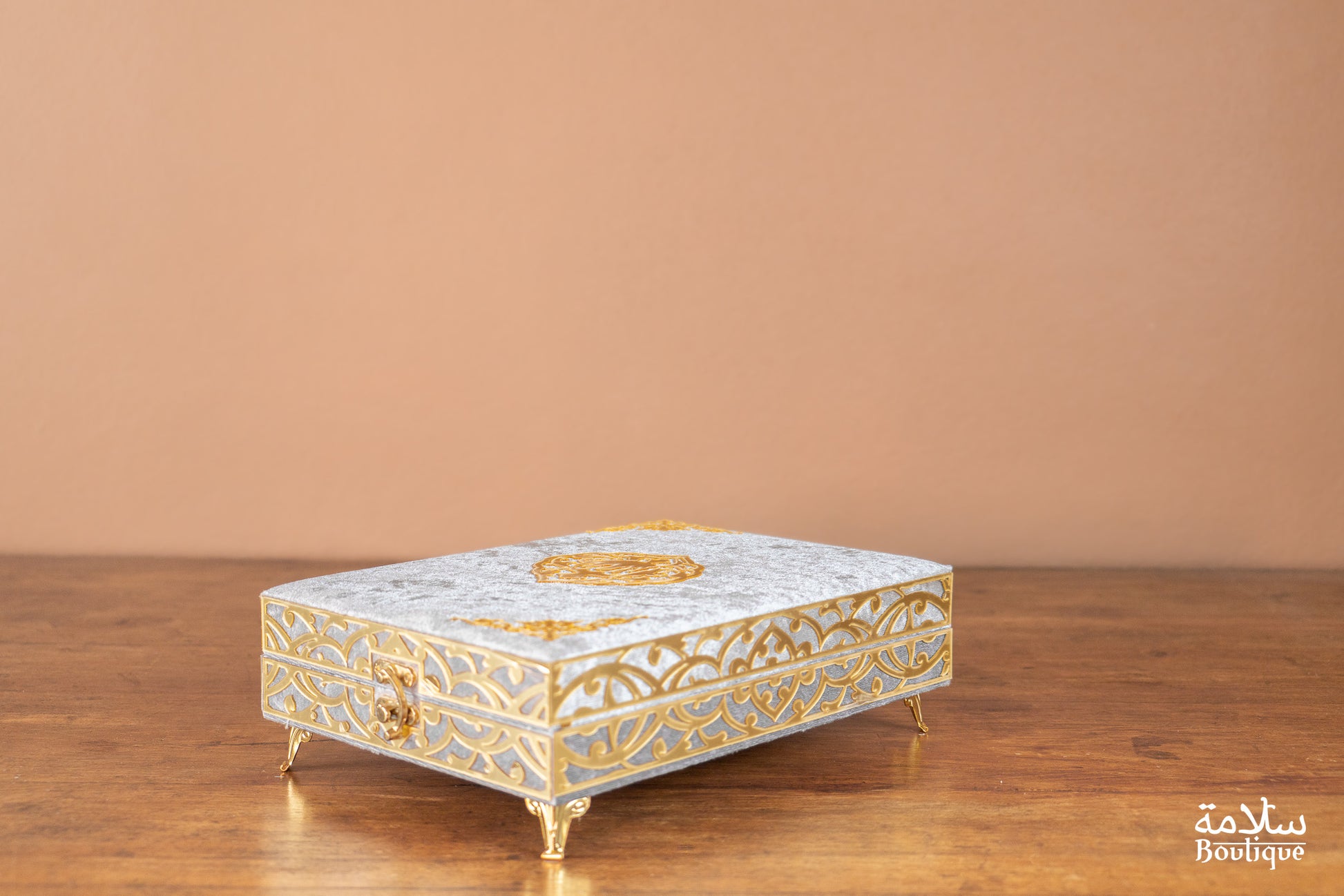 Découvrez notre magnifique coffret en velours argenté orné de finitions dorées. Avec son rabat élégant, il ajoute une touche luxueuse à votre collection. Sobre et élégant, il sera le parfait écrin pour vos livres sacrés. Offrez-vous un accessoire à la hauteur de votre raffinement !