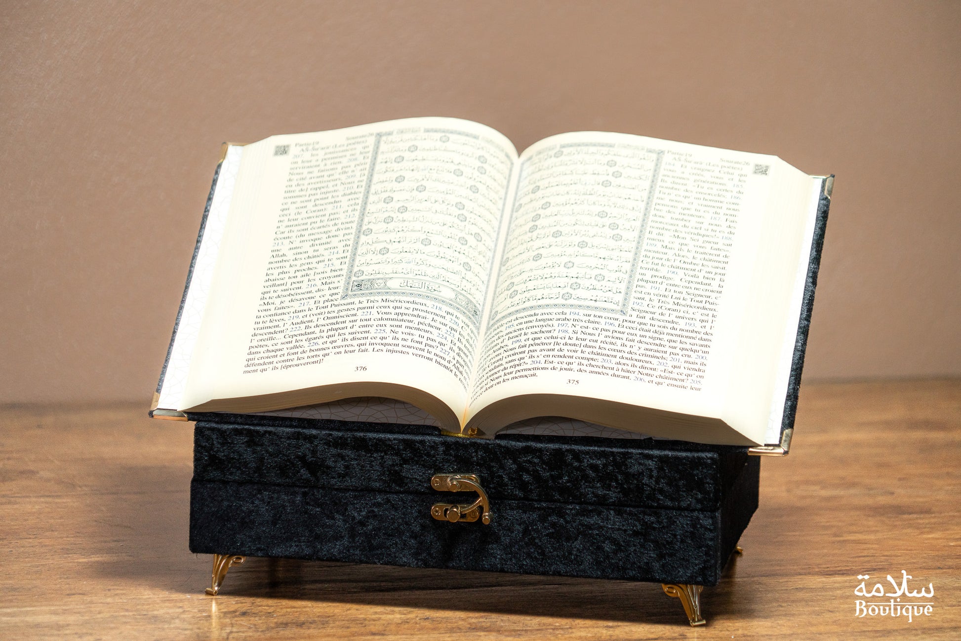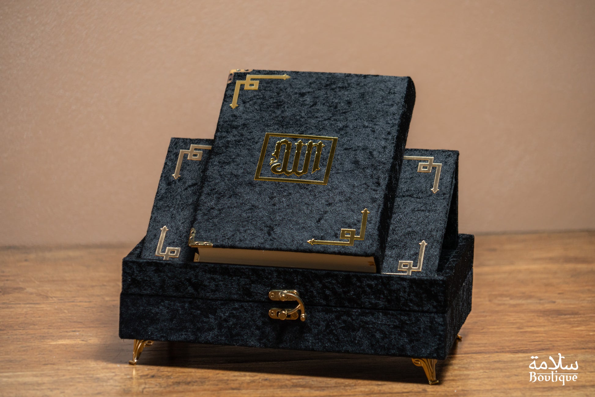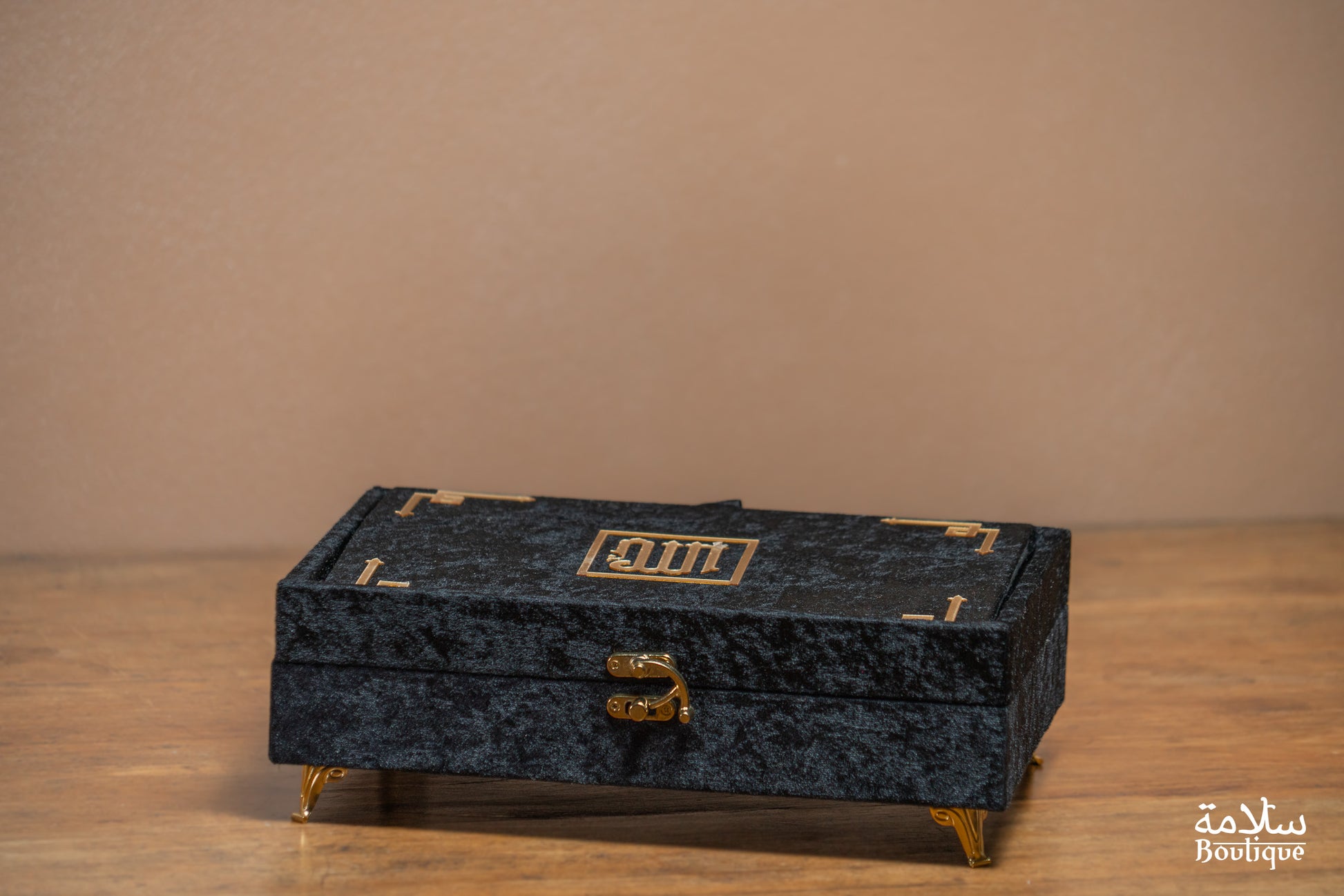 Découvrez notre magnifique coffret en velours noir orné de finitions dorées. Avec son rabat élégant, il ajoute une touche luxueuse à votre collection. Sobre et élégant, il sera le parfait écrin pour vos livres sacrés. Offrez-vous un accessoire à la hauteur de votre raffinement !
